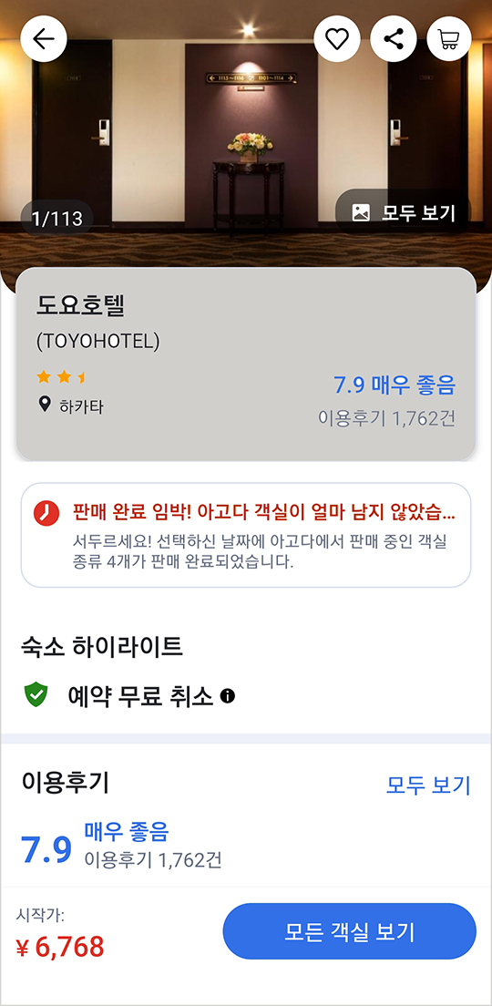 호텔요금은 변덕이 심해서 수요가 많으면 가격이 확 올라갑니다.. 하카타 그린 1호관 2박째 요금이 1일째 요금보다 두배정도 비싸서 연박 포기하고 인근의 토요 호텔로 예약했네요.. 1박 5천엔대라는 지극히 저렴한 호텔이어서 아무런 기대감이 없었으나 생각보다 괜찮았던.. 일단 하카타역 도보2분이란 좋은 입지였으니까 노불만.. 후쿠오카 호텔은 아고다에서 예약.. 최저가보장이라서 동일한 조건의 호텔이라면 아고다가 가장 저렴할 수밖에 없습니다.. 호텔 예약 팁 : 날짜별 가격이 많이 차이나면 과감히 연박을 포기하고 다른 호텔을 잡으세요.. 나름 저렴이 여행의 팁~.. 토요 호텔 : 67,000원..