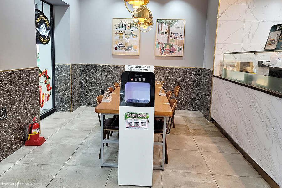 코로나 바이러스 대응도 철저하네요.. 손소독제가 아닌 손소독기가 있음.. ㄷㄷㄷ.. QR 체크인 패드 당연 있고.. 키오스크도 2대 들여놨네요.. 그리고 카운터랑 주방 쪽은 아예 공간을 분리해버림.. 엔제리너스의 노력에 박수를 보냅니다.. 다른 카페들도 이런 식으로 대응하면 좋을텐데요..