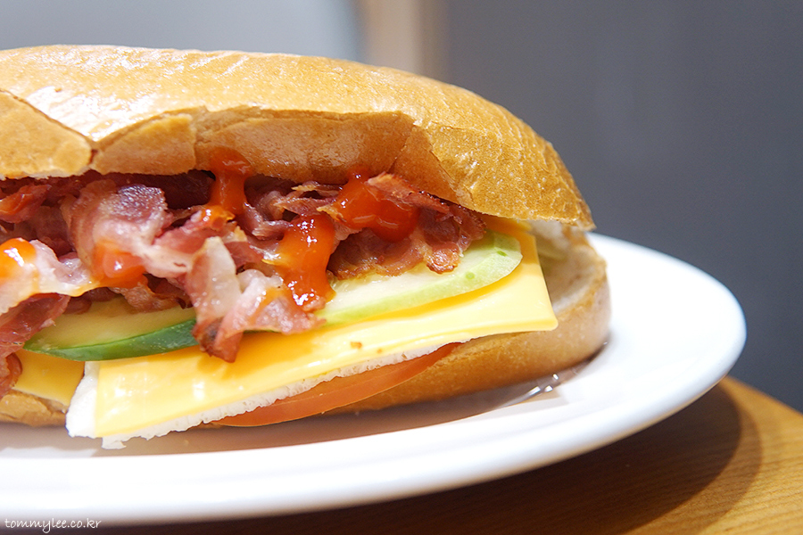 메뉴판 이미지 사진과 거의 똑같이 나옴.. 워낙 내용물이 빵빵하다 보니 베이컨이 일부 탈출 시도 중이네요.. ㅋㅋㅋ..