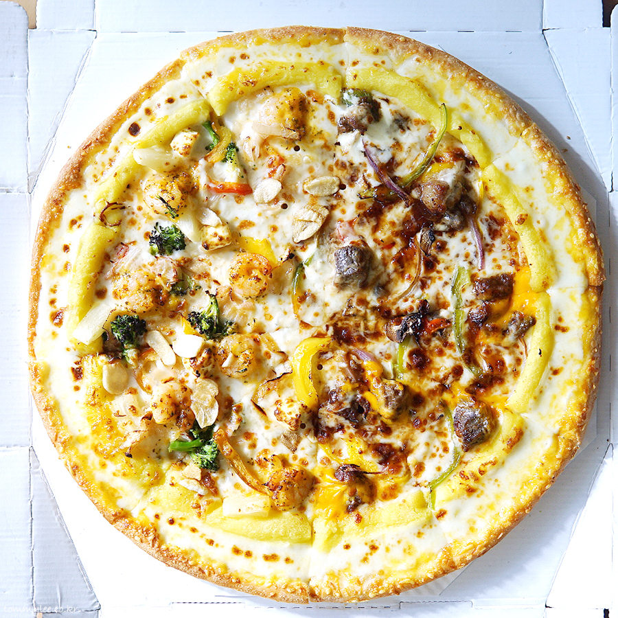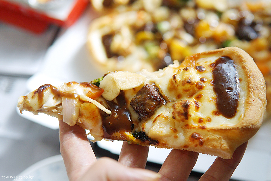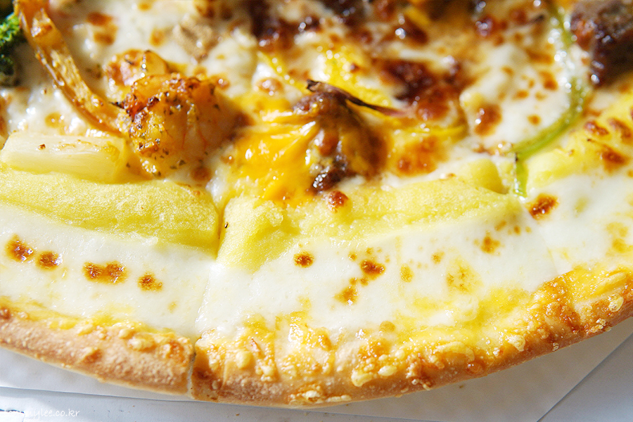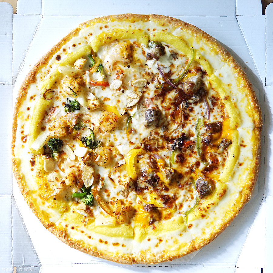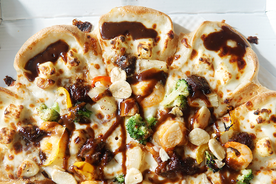 중심 토핑은 안심 스테이크, 통새우, 통마늘, 갈릭후레이크 정도가 되겠는데 그 이외에도 엄청나게 많은 토핑이 들어갑니다.. 파인애플까지 들어갈 줄은 상상도 못 했는데.. 이래도 만족을 못하겠니 하고 넣을 수 있는 건 다 넣은 느낌입니다.. 엣지에는 바베큐소스, 스테이크에는 블랙알리오 소스, 쉬림프에는 케이준마요 소스가 들어가서 콤보스런 맛이 납니다..