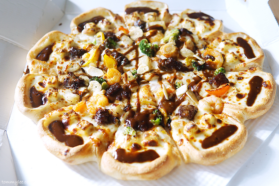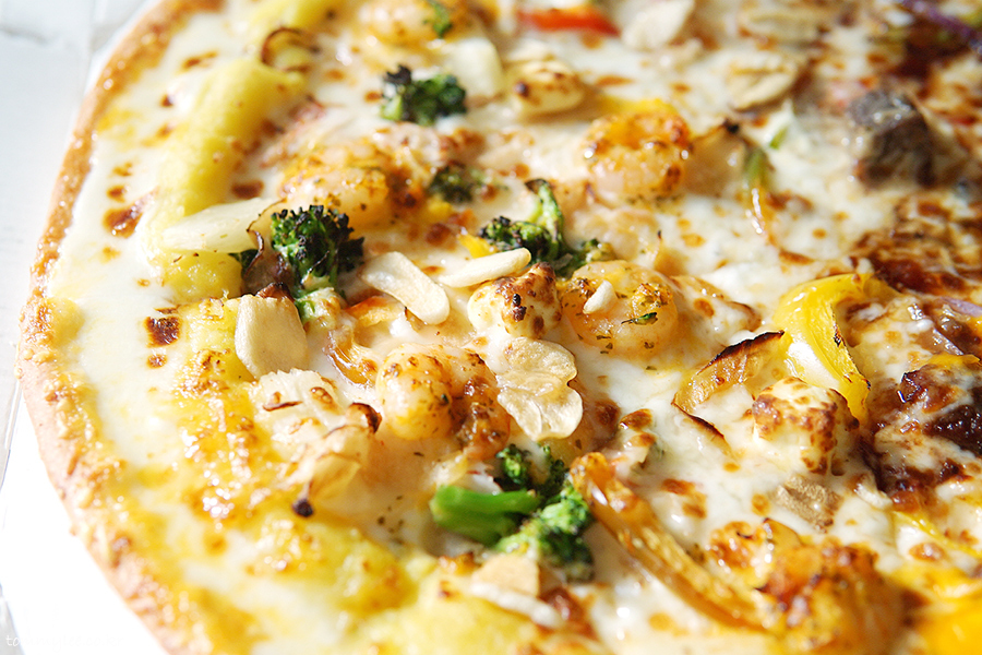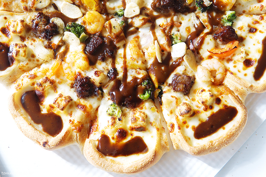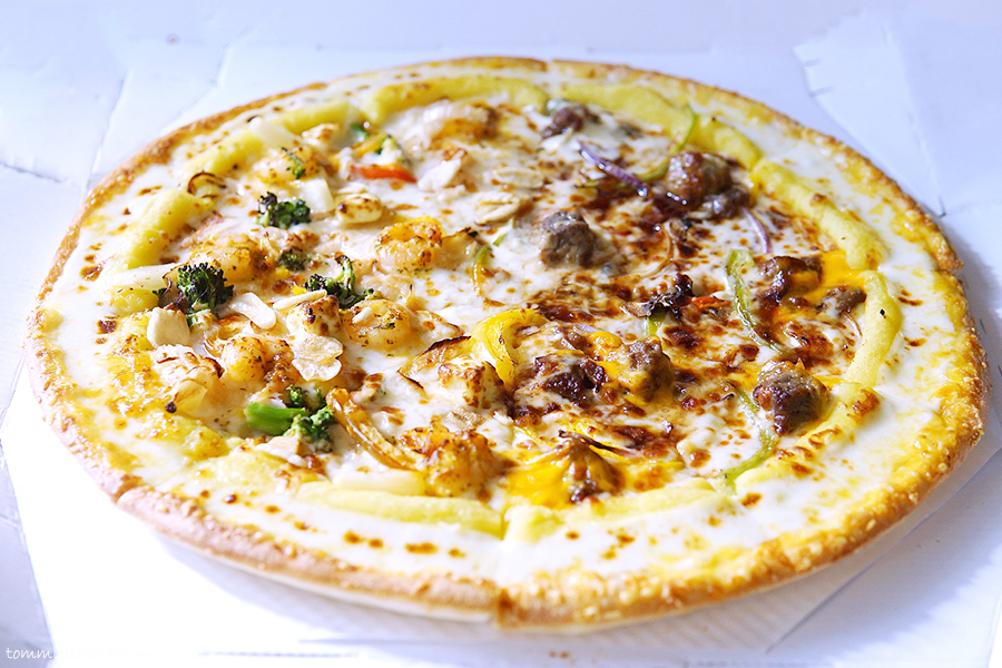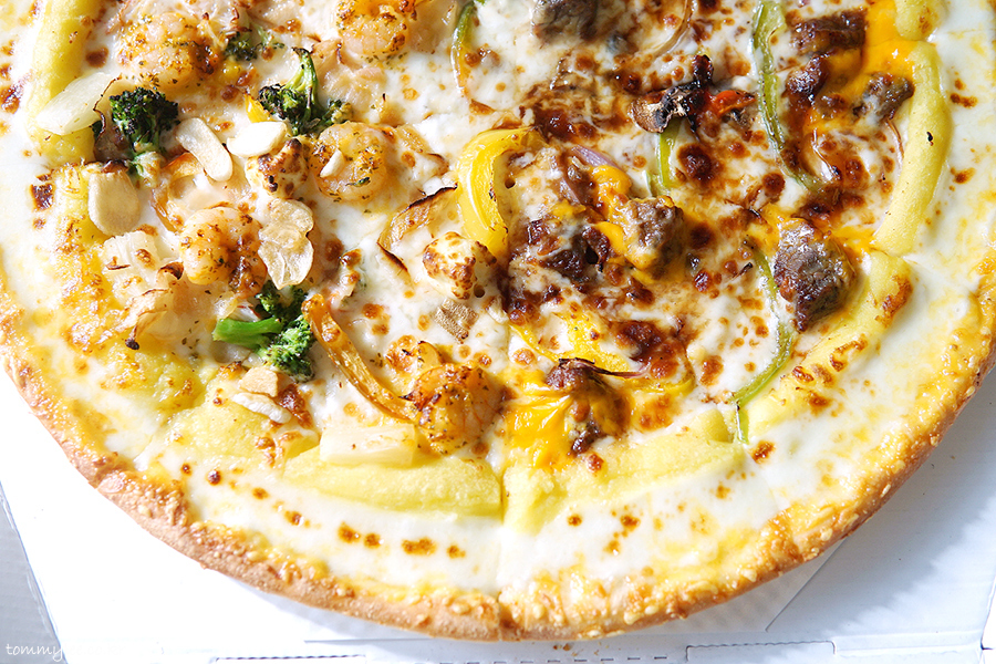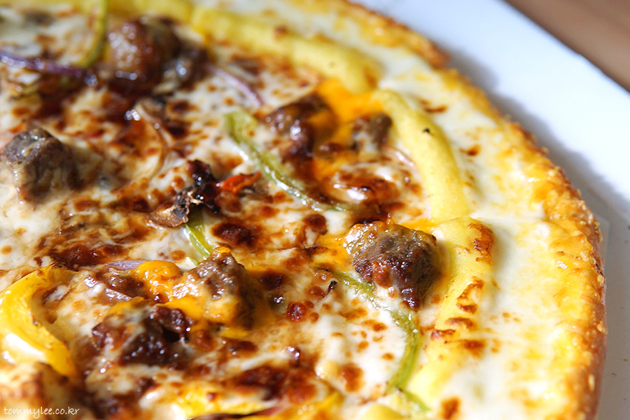 중심 토핑은 안심 스테이크, 통새우, 통마늘, 갈릭후레이크 정도가 되겠는데 그 이외에도 엄청나게 많은 토핑이 들어갑니다.. 파인애플까지 들어갈 줄은 상상도 못 했는데.. 이래도 만족을 못하겠니 하고 넣을 수 있는 건 다 넣은 느낌입니다.. 엣지에는 바베큐소스, 스테이크에는 블랙알리오 소스, 쉬림프에는 케이준마요 소스가 들어가서 콤보스런 맛이 납니다..