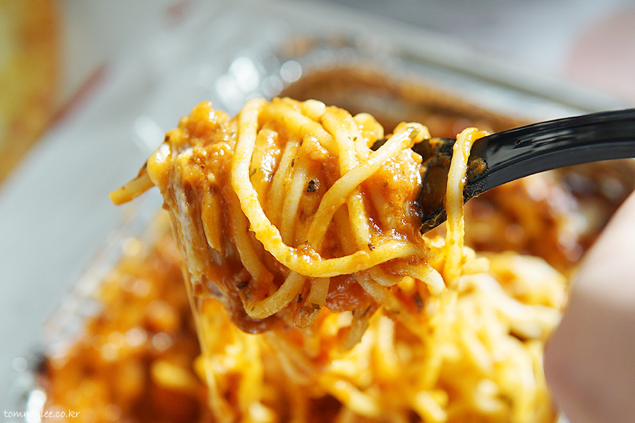 포크로 집어 들면 이런 느낌.. 아~ 무겁다.. 치즈가 많아서 중량감이 있네요.. 스파게티 면과 소스가 잘 섞이도록 비비기 작업해주신 후에 드셔야 한다는 거..