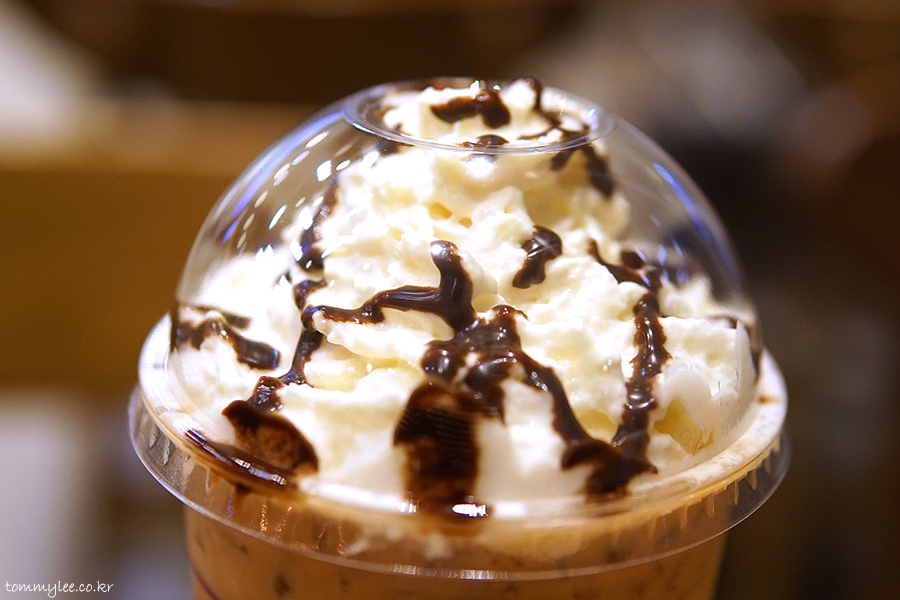 휘핑크림 많이~를 외쳤으나 안 많이 주심.. ㅠ.ㅠ.. 그냥 아이스모카와 다를 게 없어 보이는 비주얼.. 카라멜 드리즐도 같이 뿌려 주는 게 좋을 듯한데..