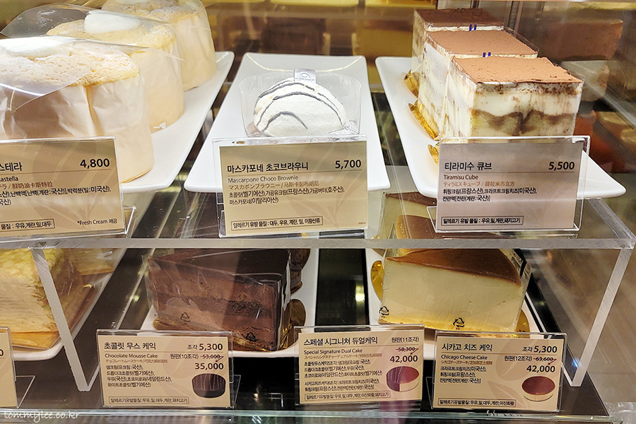 제가 먹고 싶었던 딸기 올라간 케익은 전혀 없었고 늘 보던 케이크들 뿐이었네요.. 마스카포네 초코 브라우니 먹을까 했는데 저 브라우니가 엄청 배부르거든요.. 혼자서 먹긴 힘든 메뉴라 기본 메뉴인 시카고 치즈케익으로..