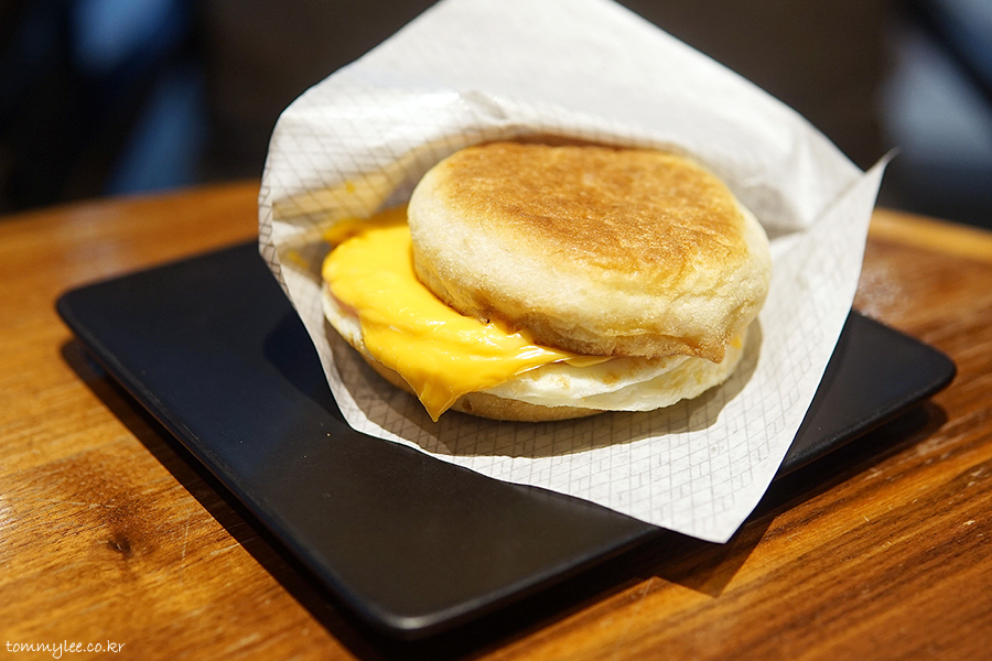샌드위치 이름 그대로 치즈와 햄, 계란이 들어간 정직한 구성의 잉글리쉬 머핀 샌드위치.. 빵 퀄리티가 꽤 좋아서 늘 만족스러웠으나 오늘은 단단해서 안만족(--).. 그래도 가볍게 끼니를 때우기에 정말 좋은 아이템..
