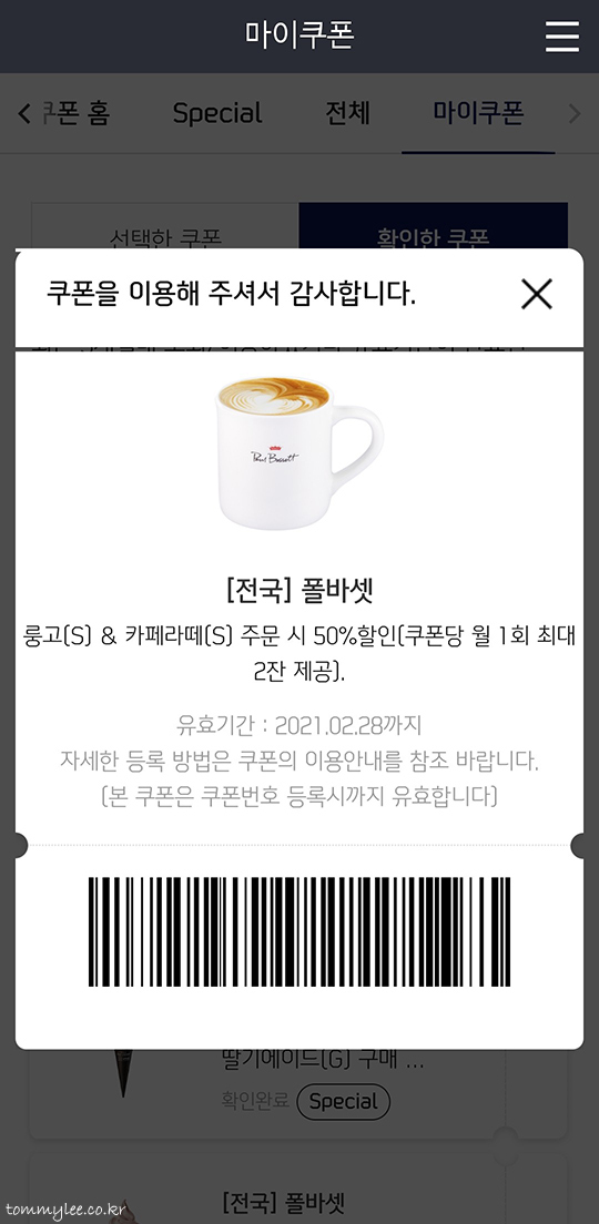 폴바셋 커피 가격이 경쟁업체보다 조금 비싸지만.. 저처럼 쿠폰을 이용하면 오히려 저렴하게 드실 수 있다는 거.. 제가 사용한 카페룽고 & 카페라떼 50%할인쿠폰의 모습.. 폴바셋은 쿠폰 인심이 의외로 후해요.. 저 쿠폰의 경우 신한카드로 결제해야 한다는 핸디캡(?)이 있긴 하지만 뭐 그 정도쯤이야 해줄 수 있는 거죠.. 일행 커피까지 2잔 할인받을 수 있어 지인분께서도 매우 좋아하는 쿠폰..