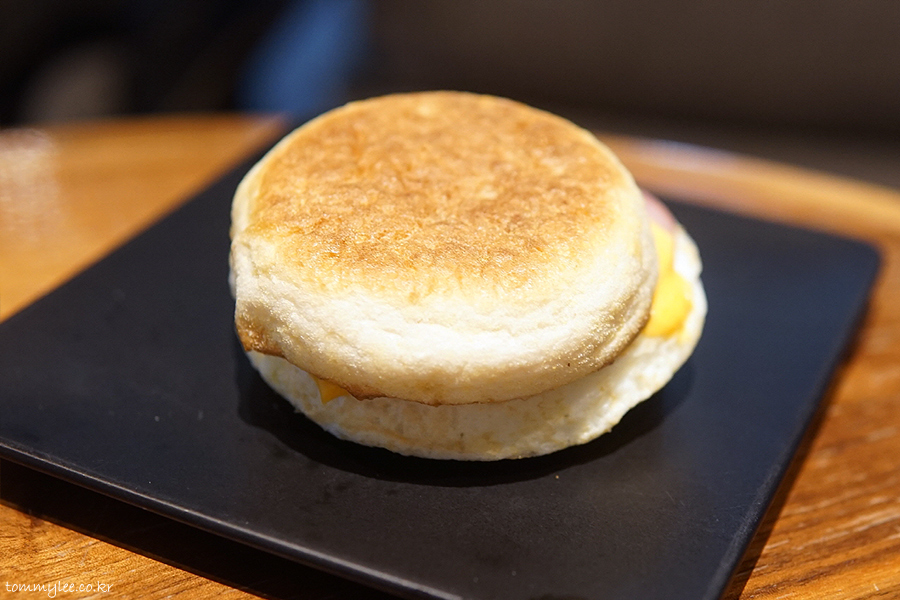 따뜻하게 데워주는 핫 샌드위치.. 따뜻하고 바삭한 컨디션의 잉글리쉬 머핀을 늘 즐기실 수 있습니다.. 오늘 바텀 쪽은 오버힛으로 딱딱하게 굳어 칼로 잘리질 않아서 커팅실패.. 샌드위치 단면을 못 보여 드리는 게 살짝 아쉽네요..