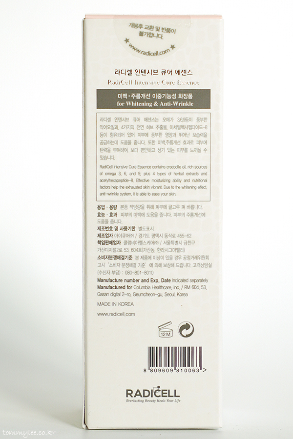 라디셀 인텐시브 큐어 에센스는 오메가 3,6,9 등이 풍부한 악어오일과 4가지의 천연 허브 추출물, 아세틸헥사펩타이드8 등이 함유되어 있어 피부에 풍부한 영양과 뛰어난 보습력을 공급하는데 도움을 주고.. 미백, 주름개선 효과로 피부에 탄력을 부여해, 보다 편안하고 생기 있는 피부를 느낄 수 있다고 길게~ 써있습니다..