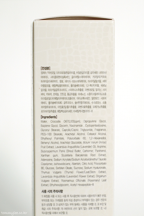 전성분 : 정제수,악어오일, 다이프로필렌글라이콜, 부틸렌글라이콜, 글리세린, 나이아신아마이드, 사이클로펜타실록세인, 글리세릴스테아레이트, 카프릴릭/카프릭트라이글리세라이드, 향료, 피이지-100스테아레이트, 아라키딜알코올, 세테아릴알코올, 에칠헥실팔미테이트, 폴리솔베이트60, 1,2-헥산다이올, 베헤닐알코올, 아라키딜글루코사이드, 스타아니스추출물, 라벤더오일, 알지닌, 시어버터, 카보머, 판테놀, 잔탄검, 폴리아크릴아마이드, 황금추출물, 아데노신, C13-14아이소파라핀, 알란토인, 시트렉애씨드, 라우레스-7 글루코오스, 수크로오스, 소듐하이알루로네이트, 타임꽃/잎/줄기추출물, 라벤더꽃추출물, 오레가노추출물, 로즈마리잎추출물, 에틸헥실글리세린, 아세틸헥사펩타이드-8.. MADE IN KOREA..