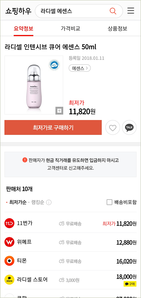 라디셀 에센스 정가는 48,000원이지만 저 가격에 사는 사람은 아무도 없을 듯.. 라디셀 카카오 스토어에서도 18,000원에 판매 중이고.. 11번가, 위메프 등은 더 저렴하고 하네요.. 근데 가격비교 사이트를 통해서 구입해야 저 가격이 나옵니다.. 다음 쇼핑하우 바로가기 → 요기로..
