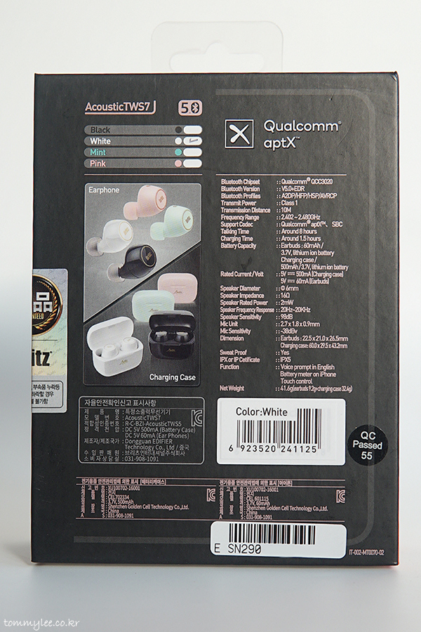 박스에 나온 어쿠스틱 TWS7 스펙을 적어 보면.. 제품명 : 특정소출력무선기기, 모델명 : AcousticTWS7, 칩셋 : 퀄컴 QCC3020, 버전 : V5.0+EDR, 프로파일 : A2DP/HFP/HSP/AVRCP, 출력 : 클래스1, 수신거리 : 10M, 레인지 2.402~2.480GHz, 서포트코덱 : APT-X, SBC, 전격전압 : 5V=500mAh, 이어버드 60mAh 케이스 500mAh, 다이어미터 6mm, 유닛 : 6mm, 임피던스 : 16옴, 출력 : 2mW, 특성 : 20Hz~20KHz, SPL : 98dB, 마이크 : 2.7x1.8x0,9mm, -38dB, 사이즈 : 이어버드 22.5x21.0x26.5mm 케이스 60.0x29.5x43.2mm, 방수 : IPX5, 무게 : 41.6g(9.2+32.4g).. MADE IN CHINA..