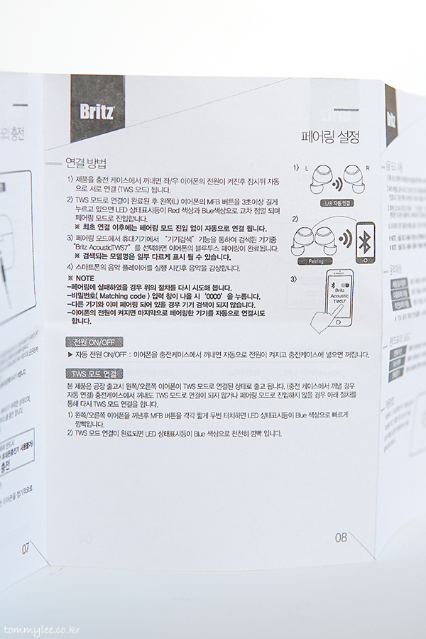 블루투스 연결방법입니다.. 충전케이스에서 꺼내면 자동으로 TWS모드가 된다고 합니다 당연하지만.. 강제 페어링모드 진입은 이어폰 왼쪽을 3초 이상 길게 누르면 된다는 설명..