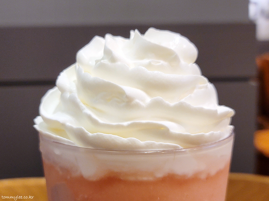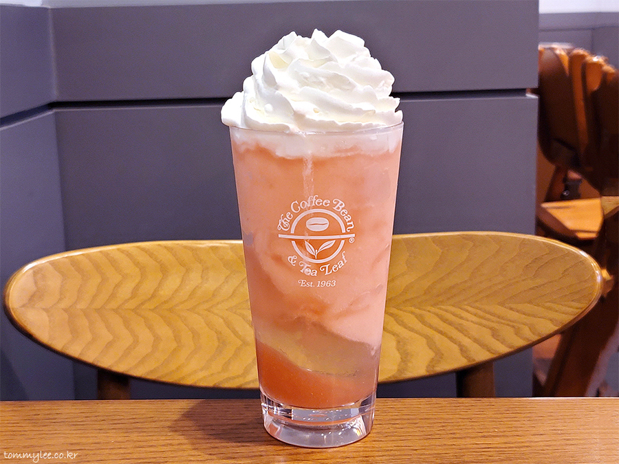 당연하게도 레귤러 단일 사이즈 음료.. 원래 과일계 블렌디드는 휘핑크림 올라가지 않는데 무료 엑스트라 혜택으로 휘핑크림 추가.. 커피빈은 휩많이요 하면 정말 많이 준다죠??..