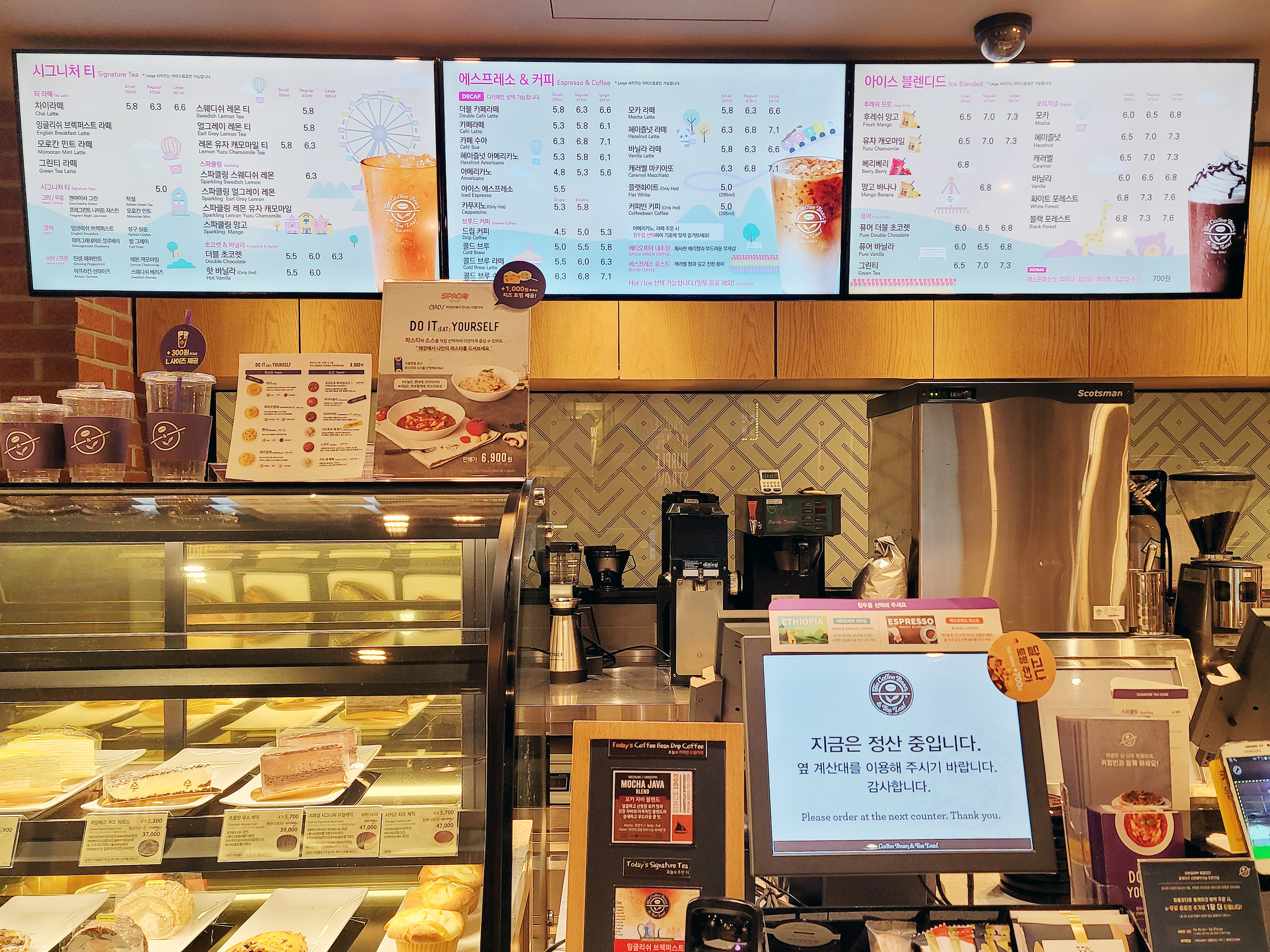 직원분이 마감청소하느라 바쁘셔서 캐셔가 빈 틈을 타서 폰카로 메뉴판을 후다닥 찍어 봤습니다.. 커피빈 메뉴랑 가격이 궁금하시면 사진을 눌러 보세요.. 3000픽셀로 크게 올려드렸다는..