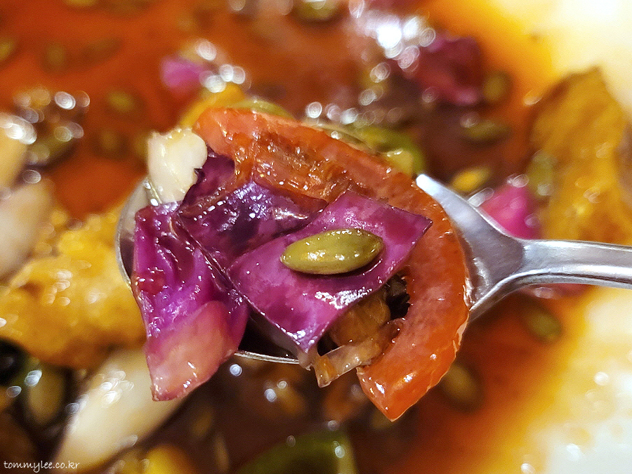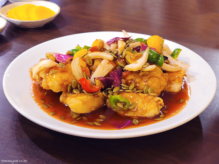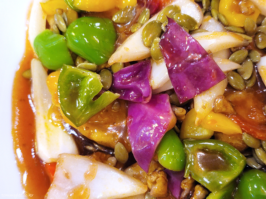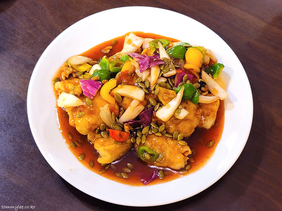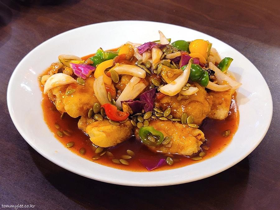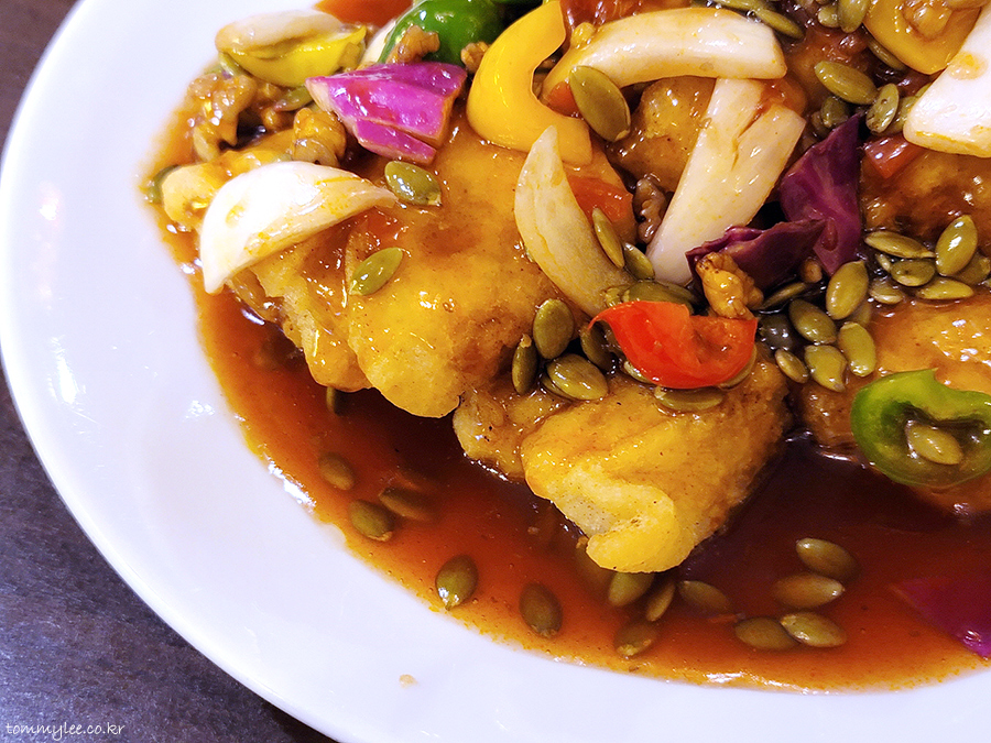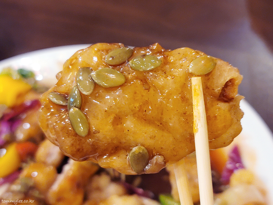 전엔 크리스피한 튀김옷에 산미가 진하고 라이트한 소스에 샹차이향도 강하고 했었지만.. 지금은 이런 모습으로.. 그래도 개성있긴 하지만요.. 호박씨가 많은게 인상적..