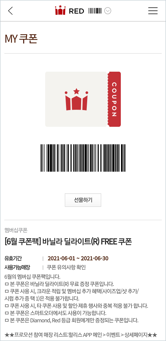 6월 멤버십 쿠폰팩은 이런 구성입니다.. 5월은 쿠폰을 4장 줬었는데 한 장 줄어 3장이 된 대신에.. 바닐라 딜라이트 무료쿠폰이 들어 왔습니다.. 추가 주문 필요 없는 순수한(?) 무료쿠폰.. 할리스가 웬일??..