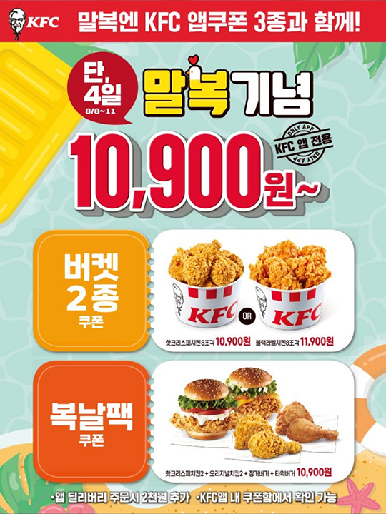8월10일은 말복.. KFC는 전통적으로(?) 복날 행사가 있습니다.. 중복에 이어 말복에도 같은 내용의 행사를 진행하네요.. 핫크리스피치킨버켓 10,900원, 블랙라벨치킨버켓 11,900원, 복날팩 10,900원.. 복날행사는 앱 딜리버리 주문 시에도 쿠폰 사용이 가능하다는 것에 주목하셔야 하겠습니다..