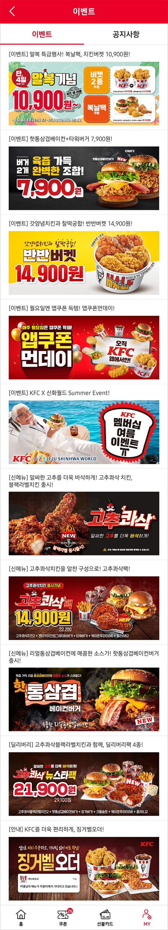 일단은 KFC 8월 행사 점검부터.. 말복기념 특급행사, 핫통삼겹베이컨+타워버거 7,900원, 갓양념 반반버켓 14,900원, 앱쿠폰 먼데이, 신메뉴 고추콰삭팩 14,900원, 딜리버리 고추콰삭 뉴스타팩 21,900원.. 행사내용은 알아두면 싸게 먹을 수 있습니다..