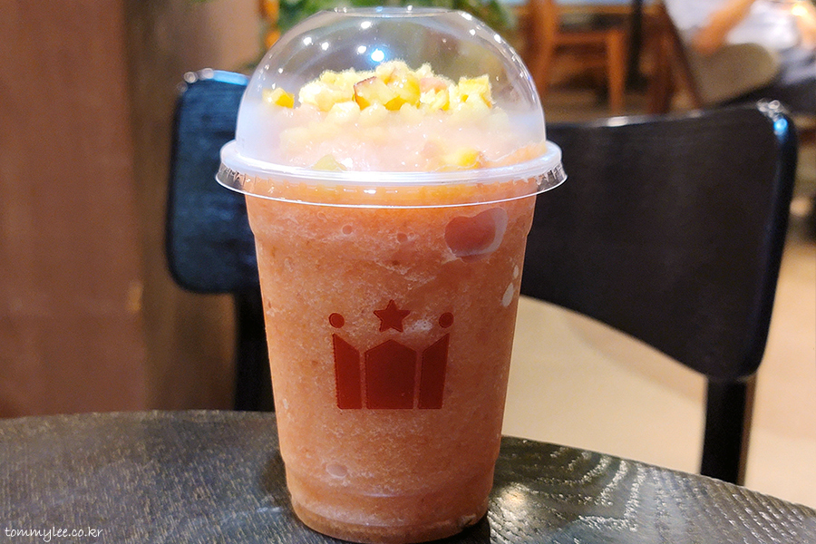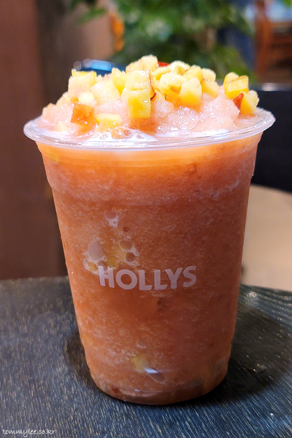 천도복숭아 토핑이 올려져 있는 건 좋은데.. 이게 냉동~ 상태여서 생과일의 질감이 전혀 나오질 않아서 실망.. 그냥 사각사각.. 이게 뭐야.. ㅋㅋㅋ..