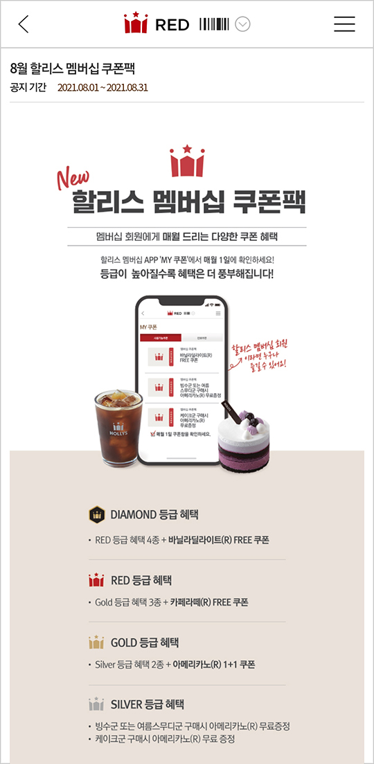 할리스 8월 멤버십 쿠폰팩.. 빙수군 또는 스무디군 구매 시 아메리카노, 케이크군 구매 시 아메리카노, 아메리카노 1+1, 카페라떼 무료 이렇게인데요.. 8월에도 쿠폰팩 덕분에 아메리카노를 듬뿍 공급받을 수 있게 되었단.. 늘 아메리카노지만 그래도 많이 줘서 좋아요..
