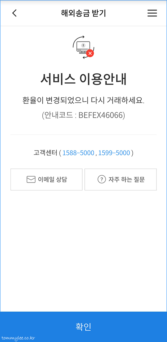 환율이 변경되었으니 다시 거래하세요.. ㅠ.ㅠ.. 5달러의 행방을 너무 오래 생각했나 봄.. 진짜 어디로 간겨.. ㅡㅡa..