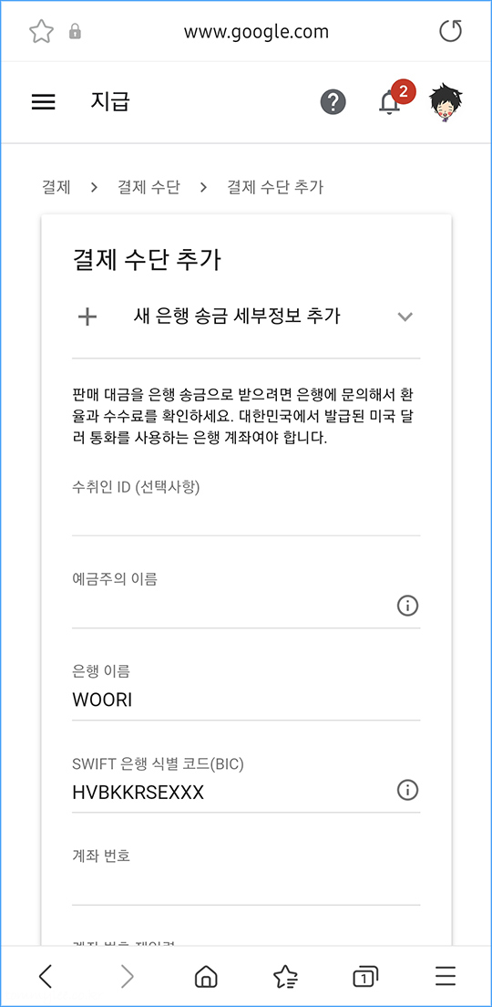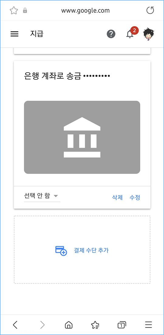 이렇게 결제수단 추가가 완료되었네요.. 구글 애드센스에서 계좌번호 입력 후에는 다시 우리은행으로 돌아와서 하셔야 할 게 있는데요..