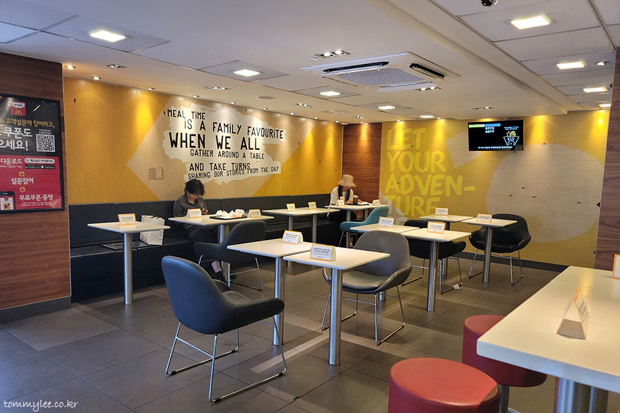 에그맥머핀 받아서 2층으로.. 오늘은 저 말고 2명 더 있네요.. 이 정도면 손님이 많은 편이라고 막.. ㅋㅋㅋ.. 진짜 버티고 있는 게 신기할 정도임.. ㅠ.ㅠ.. 여기 맥도날드는 진짜 강도 높은 거리두기를 해서 테이블 반이상 치운 건 기본이고, 남은 테이블도 테이블당 1명만 앉을 수 있게 해놨답니다.. 근처 롯데리아, 버거킹은 안 이런데 맥도널드는 마주 보고 못 먹게 막아놨어요.. 물론 옆에도 못 앉고.. ㅋㅋㅋ.. 여러 명 와도 다 흩어져서 따로따로 앉아서 먹어야 함.. 근데 여기서 각각 1명씩 앉히면 뭐하나 나가면 도로 합체될 텐데.. 이런 게 의미가 있나 싶어요.. 위에서 시켜서 하는 것이겠지만 이제는 이런 방식의 거리두기는 다시 생각해봐야 할 때가 아닌 가 싶음.. ㅡㅡ;;..