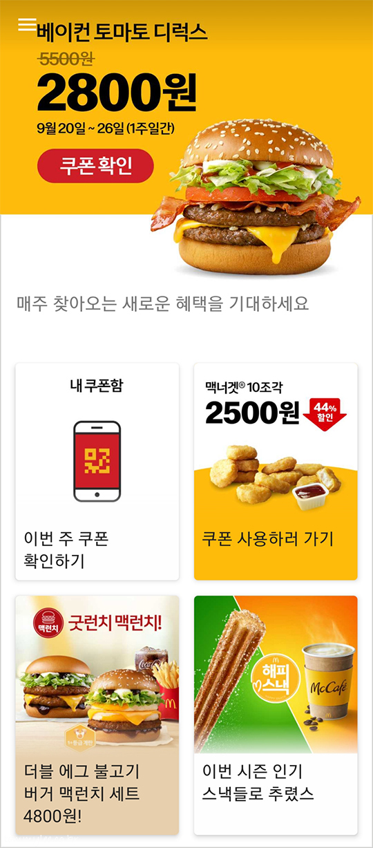 맥도날드 방문 전 맥도날드앱 확인은 필수.. 런치 신메뉴로 더블에그불고기버거 나오고 해피스낵에 추로스 추가되었네요.. 하지만 저랑은 상관없는 이야기.. 전 아침메뉴 먹으러 온 거니까..