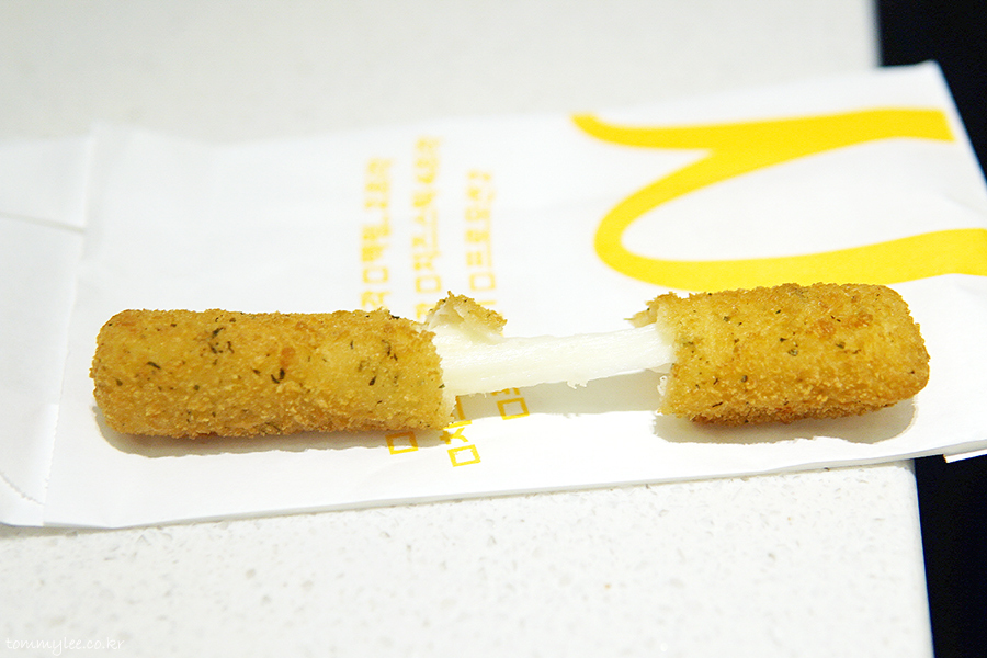 맥모닝을 치즈스틱으로 드실 때는 맥머핀 드시기 전에 치즈스틱을 먼저 드시는 걸 추천합니다.. 치즈스틱이 식으면 굳어서 이렇게 치즈가 쭉쭉 안 늘어나 거든요..