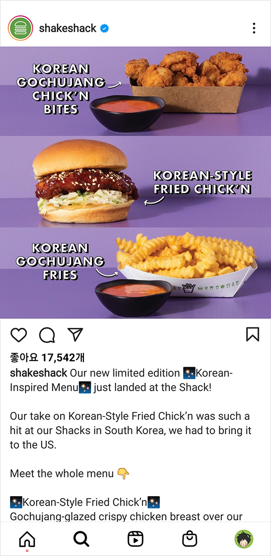 쉐이크쉑 US 인스타그램에 들어가 보니 SPC의 보도자료에 나온 주장(?)은 헛소리가 아님을 바로 확인할 수 있었습니다.. 고추장을 GOCHUJANG이라고 그대로 표기한 것은 물론이고.. 미국쉑쉑은 한술 더 떠서 GOCHUJANG 앞에 'KOREAN'까지 친절하게(?) 붙여줌.. ㅋㅋㅋ.. 우리나라엔 없는 메뉴인 고추장 치킨앤바이츠에 흑당바닐라쉐이크까지 팔고 판매 기간까지 더 길었음.. K-푸드가 유행이긴 한가 보네요.. 결론 : 허풍 아니고 진짜였다.. ㅡㅡ;;