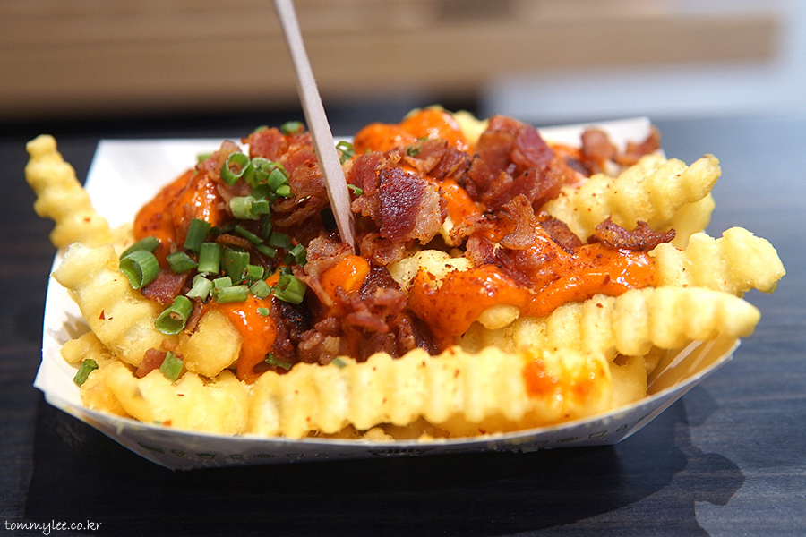 두툼한 크링클컷 프라이에 고추장 마요소스와 베이컨칩을 올리고 쪽파와 고춧가루로 장식한 그런 느낌이라 보시면 되겠네요..