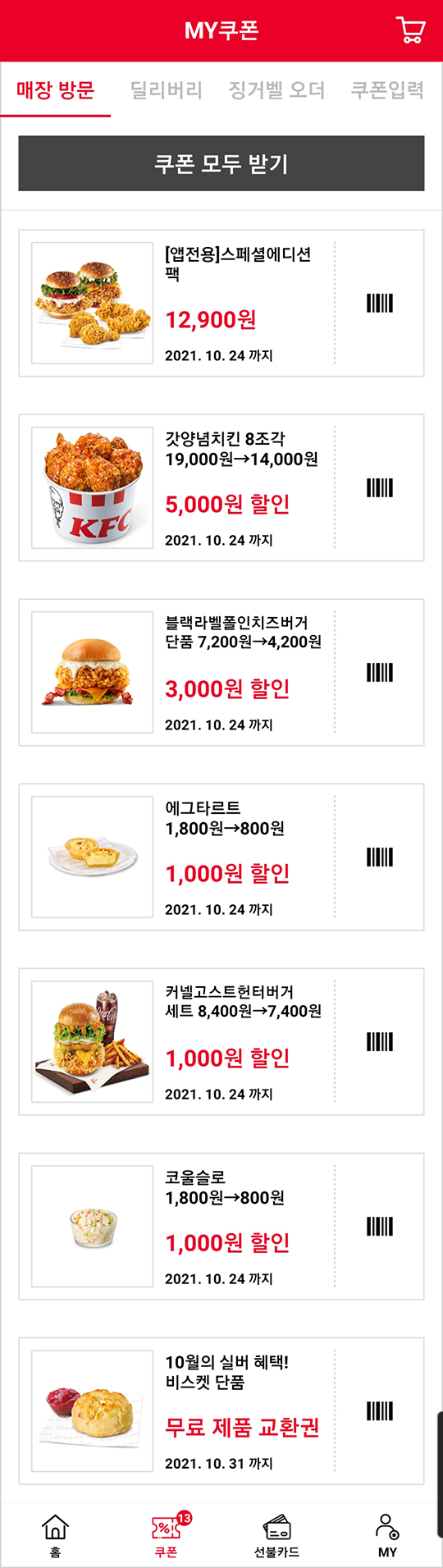10월쿠폰은 스페셜에디션팩 12,900원, 갓양념치킨 5,000원할인, 블랙라벨폴인치즈버거 3,000원할인, 에그타르트 1,000원할인, 커넬고스트헌터버거 1,000원할인, 코울슬로 1,000원할인 이렇게네요..