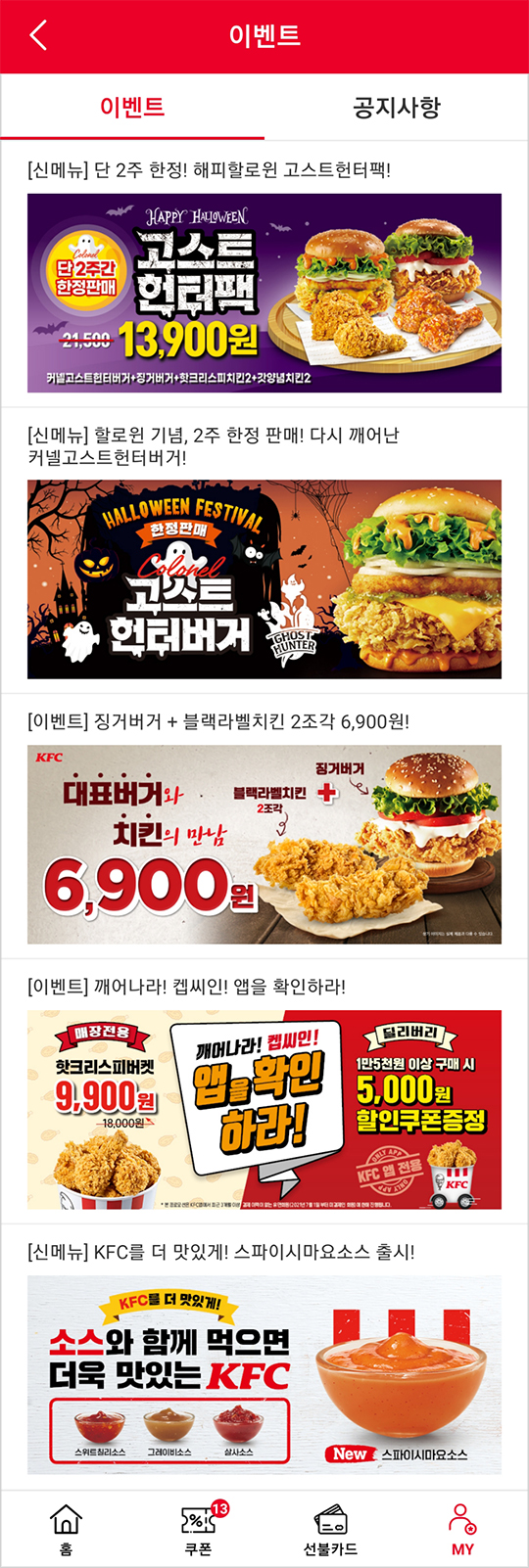 우선 KFC 10월행사 점검부터.. 2주 한정 해피할로윈 고스트헌터팩 13,900원, 징거버거+블랙라벨치킨2조각 6,900원, 핫크리스피버켓 9,900원, 딜리버리 5,000원할인이 있네요..