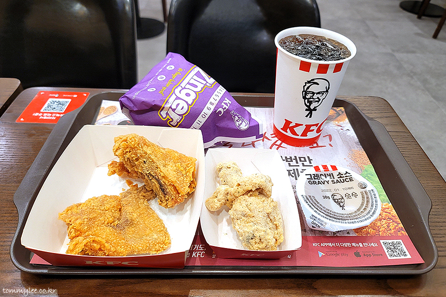 커넬 콘소메치킨을 다시 만날 날이 올런지는 의문입니다만.. 다시 먹고 싶다는 생각이네요.. KFC가 아니면 시도하지 못할 개성있는 시즈닝이었는데 말이죠.. 암튼 징거버거 쿠폰으로 푸짐한 KFC가 되었다는 스토리입니다.. 핫크리스피치킨에는 그레이비소스 잊지 마세요.. 맛이 완전히 달라진답니다..