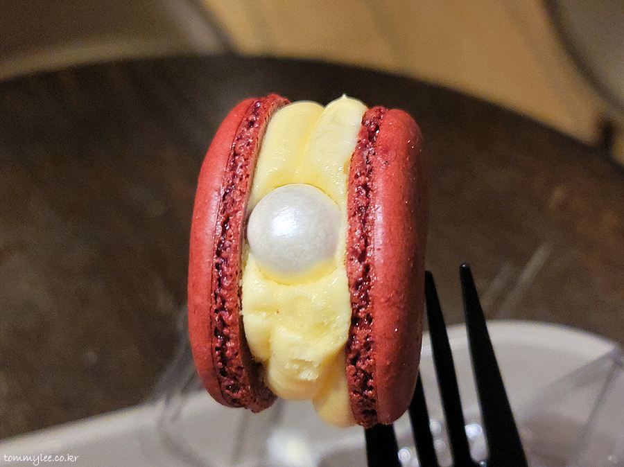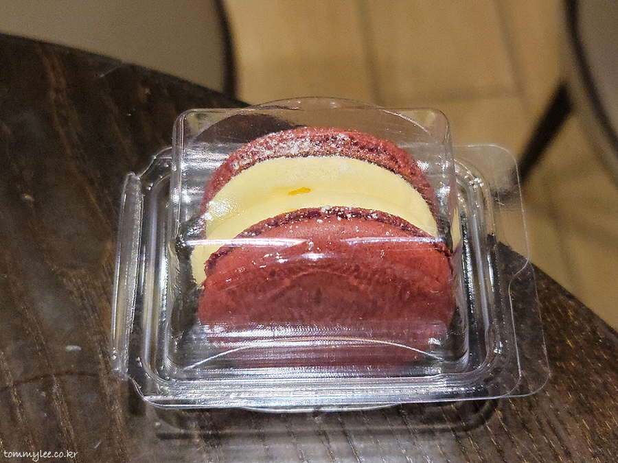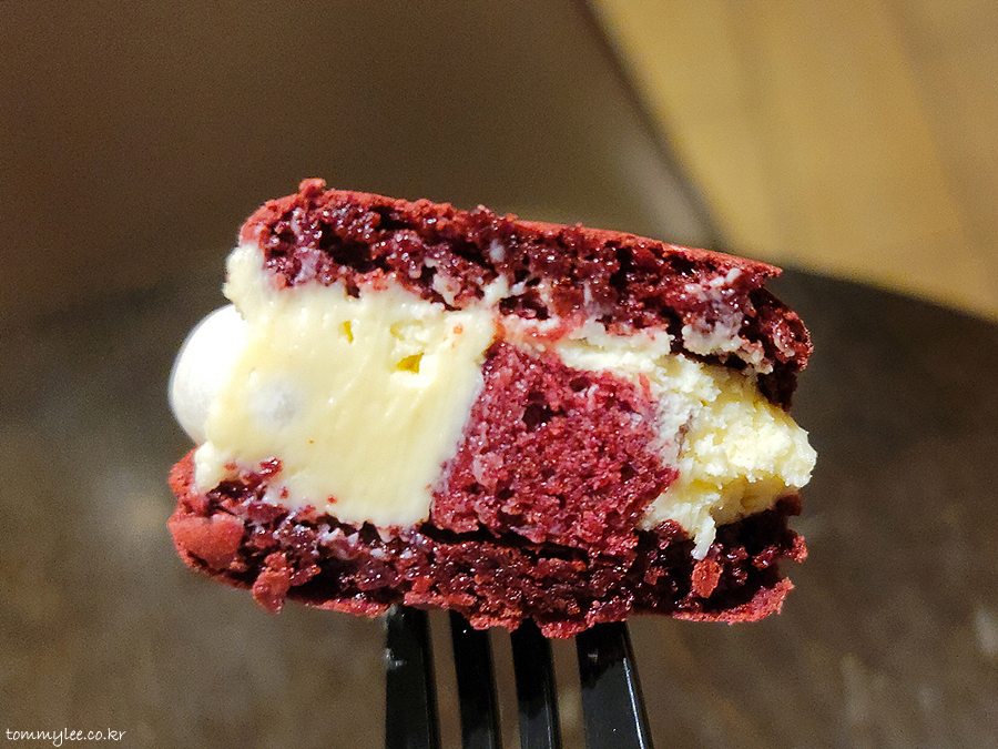 레드벨벳 뚱카롱 커팅해보면 이런 느낌.. 오호 마카롱 중앙에 레드벨벳 케이크 큐브가 들어가 있네요.. 필링은 크림치즈버터 필링입니다.. 부드럽고 치즈맛도 강하고 나쁘지 않은 듯..