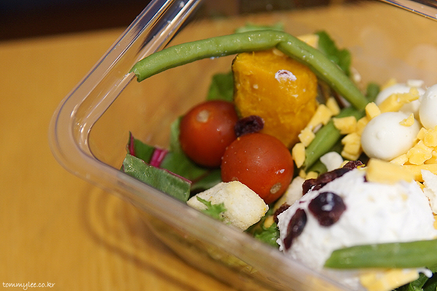 트리플 치즈와 함께 그린빈, 아몬드, 크랜베리, 방울토마토, 단호박, 크루통이 들어가는 듯.. 구성은 나쁘지 않은 듯싶네요..