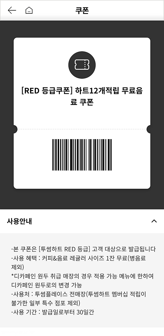 지인분께서 투썸플레이스 레드 등급쿠폰 하트 12개 적립 무료음료 쿠폰을 또 넘겨주신 덕분에 투썸플레이스를 방문할 수 있었다는.. 쿠폰이 있는데 갈 수 밖에 없지 않겠어요.. ㅋㅋㅋ.. 저렴한 아이스 아메리카노만 드시는 분이라 아무거나 주문할 수 있는 무료음료 쿠폰은 필요가 없으시다고 합니다.. 앞으로도 쭈욱 사랑의 투썸하트쿠폰 공급받기로.. ㅋㅋㅋ..