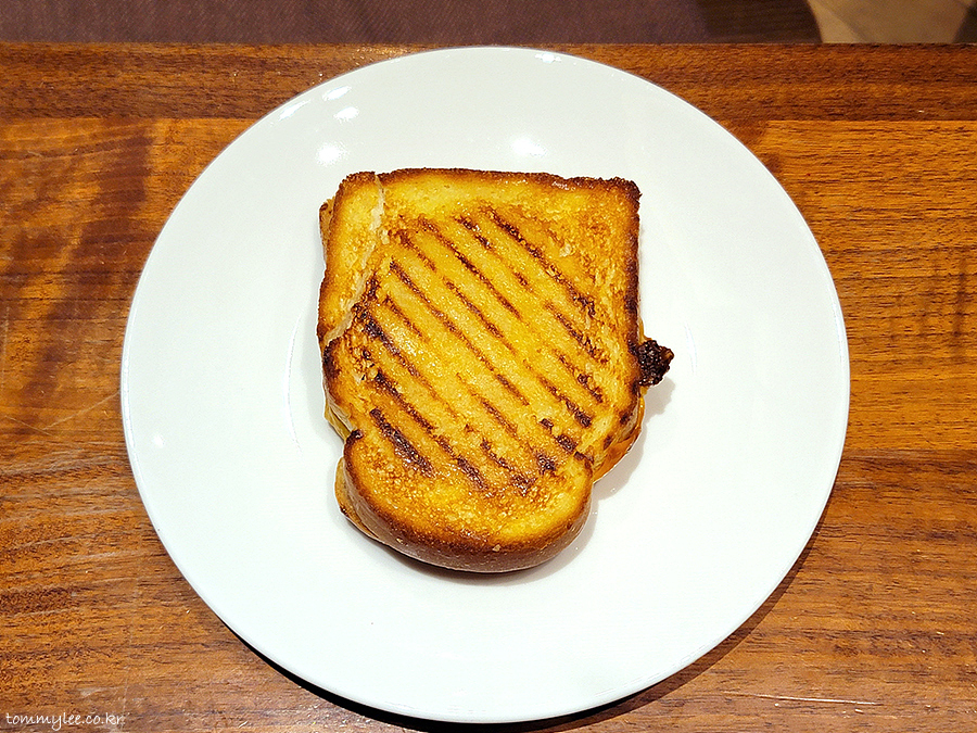 프렌치토스트 식빵 사이에 베이컨과 스크램블드에그가 들어 있어 볼륨이 강화된 게 특징.. 치즈도 모짜렐라, 고다, 체다 3가지 치즈가 들어가서 고품격.. 많이 달지도 않고 맛있어요..