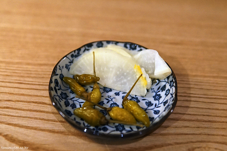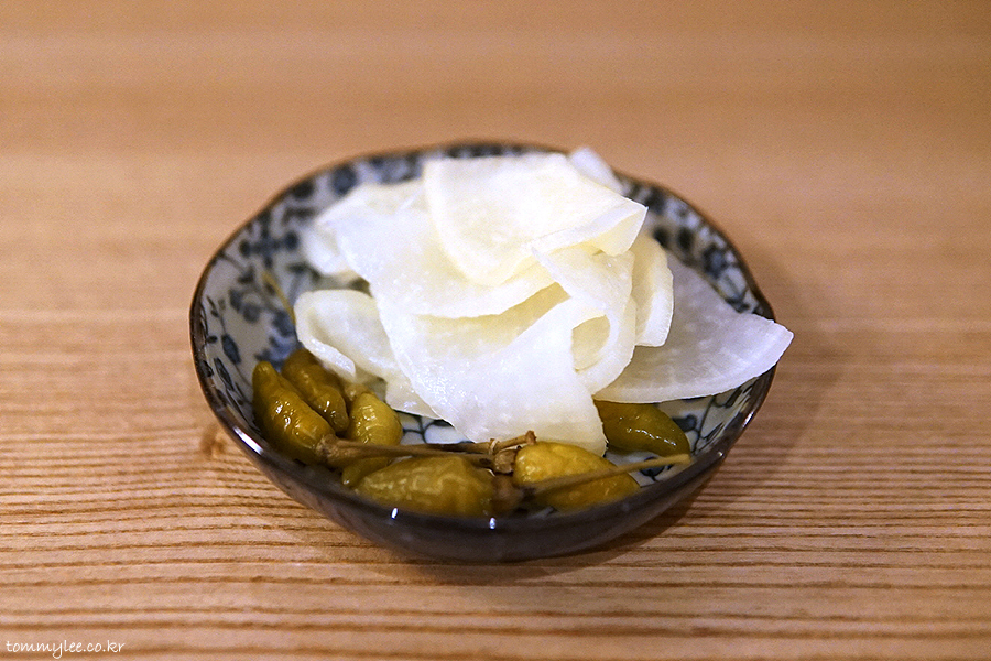 자가제 단무지와 산고추.. 단무지는 자발적 리필이 가능..