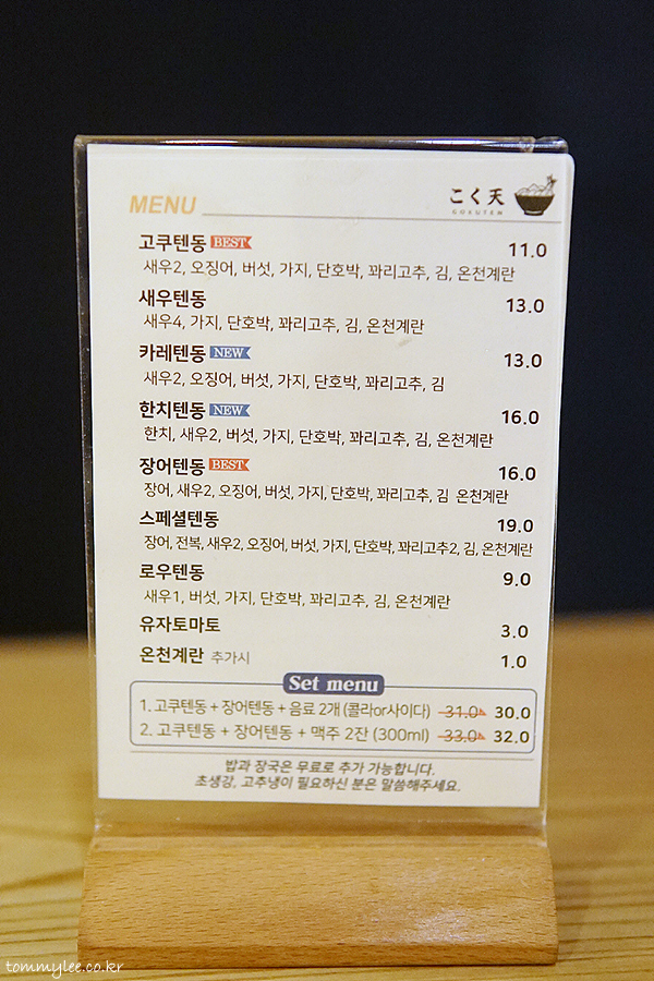 고쿠텐 메뉴 및 가격.. 고쿠텐동 11,000원, 새우텐동, 카레텐동 13,000원, 한치텐동, 장어텐동 16,000원, 스페셜텐동 19,000원, 로우텐동 9,000원, 유자토마토 3,000원, 온천계란추가 1,000원.. 고쿠텐동+장어텐동 세트메뉴는 천원 할인으로 큰 의미는 없습니다..