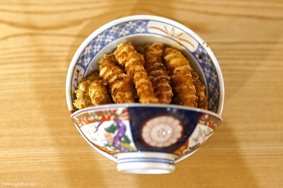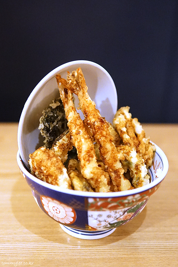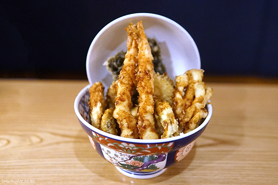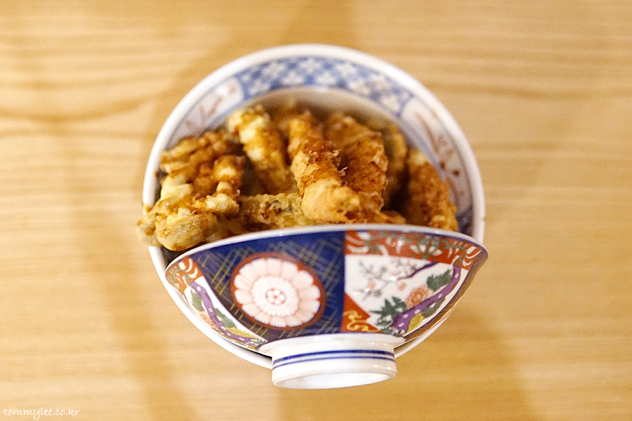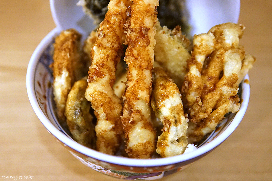 새우에 밥알 하나가 붙어 있어서 이게 눈에 확 띄었네요.. ㅋㅋㅋ.. 튀김을 따로 먹으면 편할 텐데 왜 굳이 밥 위에 산처럼 올려 먹어야 하는 건지 저는 의미를 모르겠어서 텐동을 주문하는 것보다는 텐푸라가 따로 나오는 텐정식을 선호합니다만 이 집은 정식메뉴는 없고 텐동만 판매해 선택권은 없습니다..