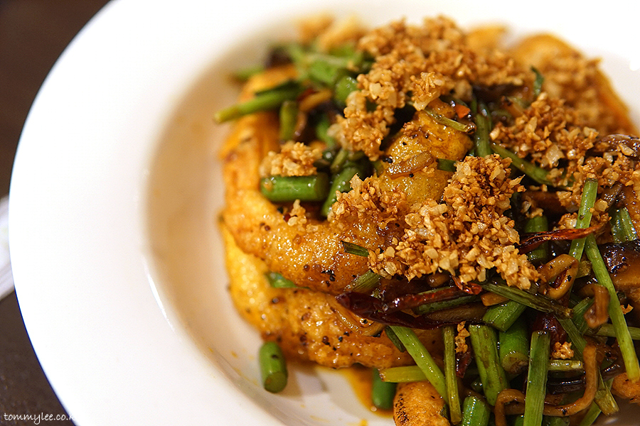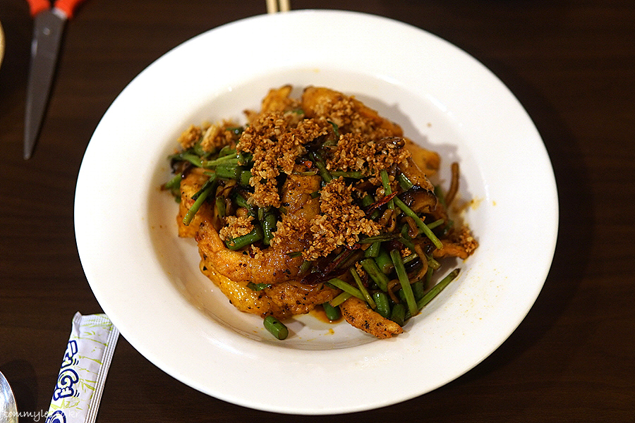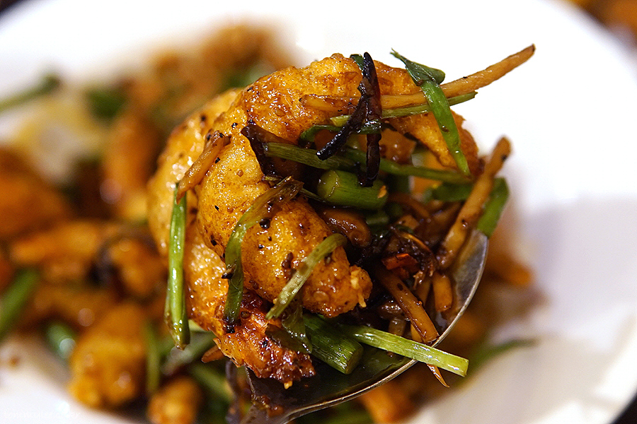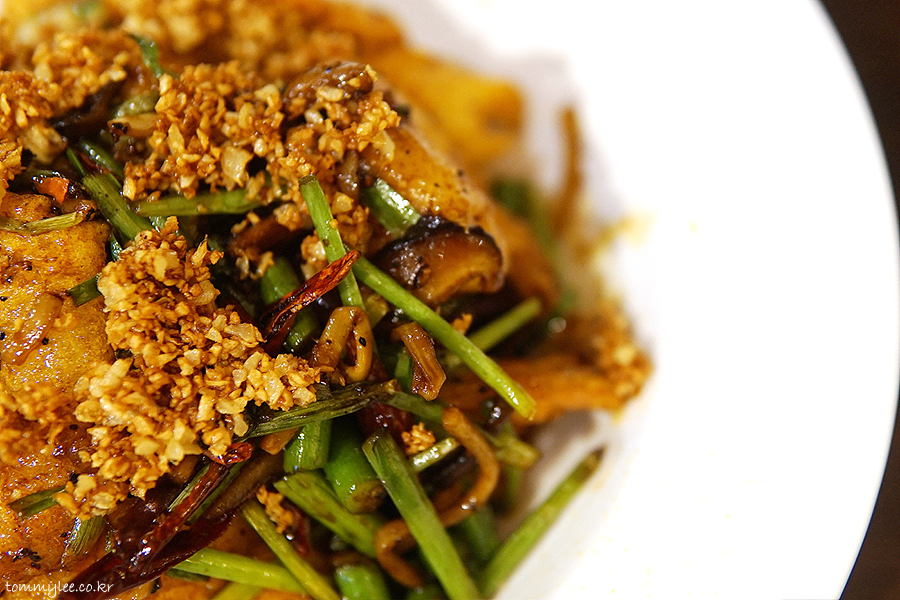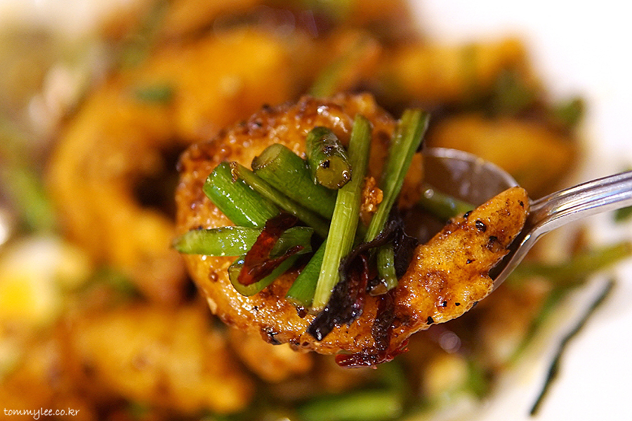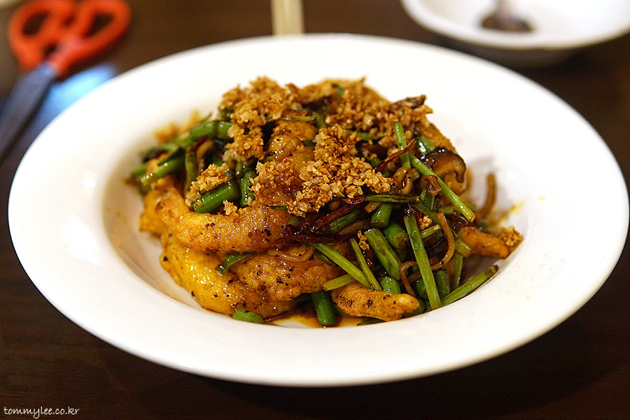 부추와 마늘쫑을 넣어 볶고 마늘후레이크를 잔뜩 올린 중새우튀김.. 새우는 12마리 제공인듯 하고요..