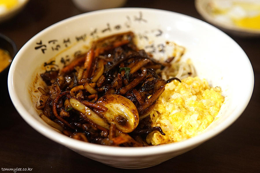 일반 중국집 간짜장과는 달리 소스에 물기가 거의 없이 건조한 느낌마저 드는 상태로 나오는 것이 특징..