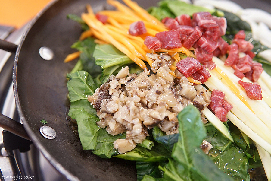 진주회관 김치볶음밥은 주재료인 김치 외에 표고버섯과 쇠고기가 들어가는 밸류 높은 고오급 김치볶음밥을 표방하고 있답니다.. 여기 시금치, 양파, 당근채, 호박채까지 들어가서 시각적인 즐거움까지 선사하는 메뉴.. 예뻐서 볶기 아깝다고 막.. ㅋㅋㅋ..