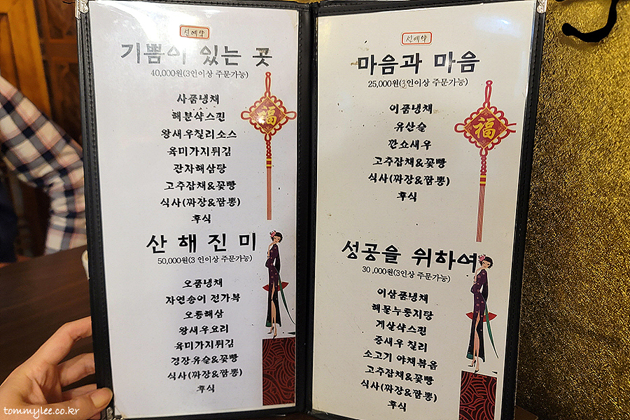 마음과 마음 25,000원, 성공을 위하여 30,000원, 기쁨이 있는 곳 40,000원, 산해진미 50,000원 코스가 있습니다.. 제일 저렴한 마음코스와 5천원 차이인데 성공코스 구성이 훨씬 좋아서 3만원 코스로 예약했네요..