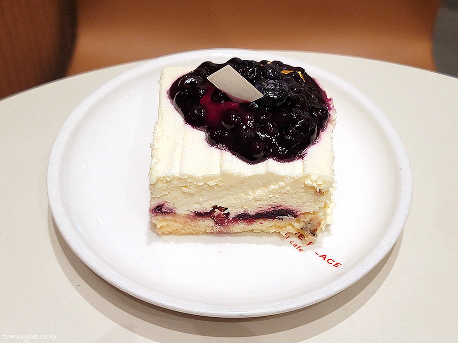 위에서 바라보면 이런 느낌.. 블루베리 잼이 잔뜩 올라가고 마름모 케익픽과 금박 장식..