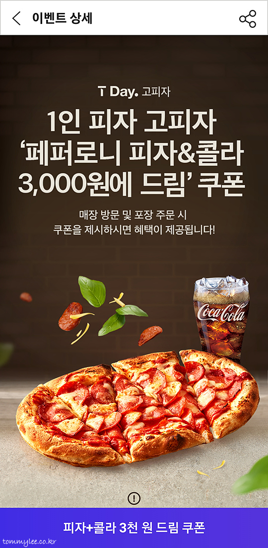 T멤버십 T데이 고피자 8월 혜택은 페퍼로니피자 & 콜라 3,000원 쿠폰.. T멤버십 앱에서 쿠폰을 다운로드해서 사용하는 방식이고.. T데이 수요일 당일에만 사용 가능한 게 아니라 수,목,금,토 무려 4일간 이용가능..