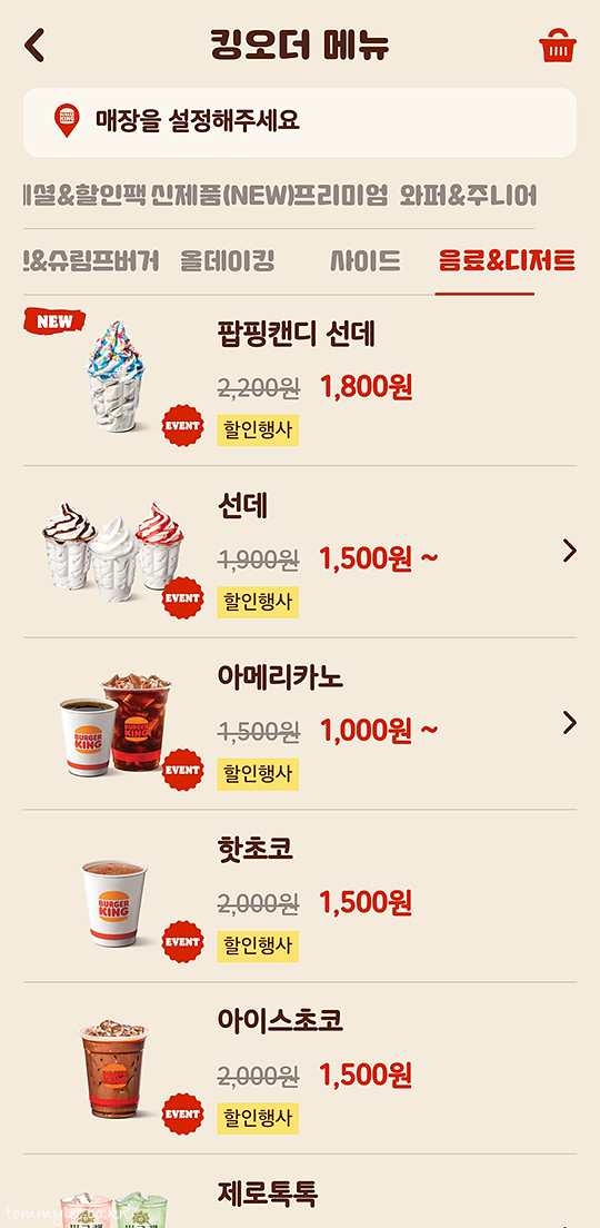 버거킹은 음료와 디저트 할인행사 메뉴가 항상 있답니다.. 그래서 카페 가는 느낌으로 가기에 좋음.. 현재 할인행사 메뉴 및 가격은.. 팝핑캔디선데 1,800원, 선데 1,500원, 아메리카노 1,000원, 아이스아메리카노 1,000원, 핫초코 1,500원, 아이스초코 1,500원, 제로톡톡 1,500원입니다..