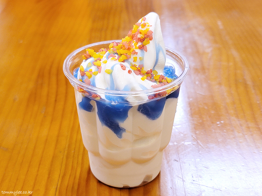 이 파란소스가 과연 무슨 맛일까 궁금했는데.. 블루큐라소계열이려나 했는데 술맛 아니고.. 소다맛이 나네요.. 암튼 여름 신메뉴다 보니 바다를 표현한 기분의 소다소스이고요..