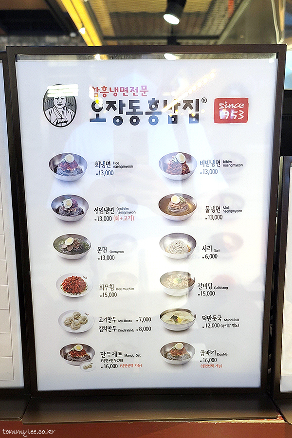 오장동 흥남집 메뉴 및 가격.. 회냉면 13,000원, 비빔냉면 13,000원, 섞임냉면 13,000원, 물냉면 13,000원, 온면 13,000원 / 회무침 15,000원, 갈비탕 15,000원, 고기만두 7,000원, 김치만두 8,000원, 떡만둣국 12,000원 / 만두세트 16,000원, 곱빼기 16,000원..